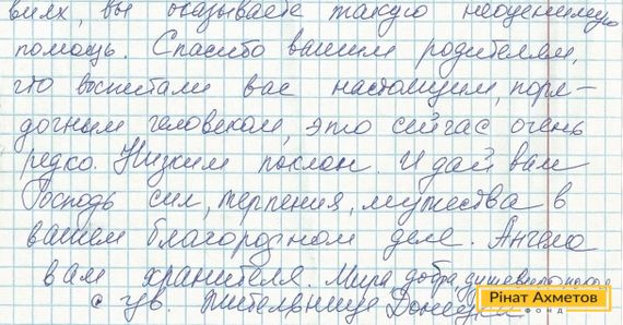 В адрес Рината Ахметова и всего большого коллектива Гуманитарного штаба пришла благодарность от дончанки за продуктовую помощь. Женщина пишет: «От всего сердца хочу поблагодарить вас лично за ту помощь, поддержку и понимание, которое вы оказываете всем без исключения жителям Донецка, от мала до велика, а особенно нам пожилым людям, которые такие же беззащитные, как и дети. Спасибо, что в таких тяжелых условиях вы оказываете такую неоценимую помощь».