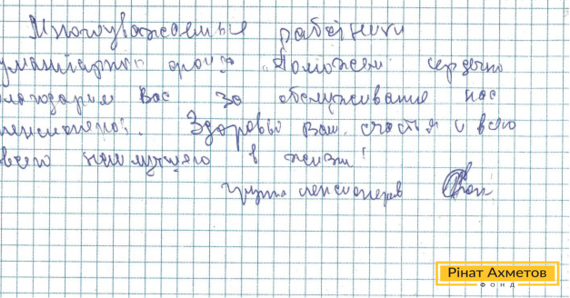 В адрес Гуманитарного штаба Рината Ахметова пришла благодарность от пенсионеров, проживающих в Кировском районе Донецка. Они пишут: «Многоуважаемые работники Гуманитарного штаба «Поможем» сердечно благодарим Вас за обслуживание нас пенсионеров. Здоровья Вам, счастья и всего-всего наилучшего в жизни».