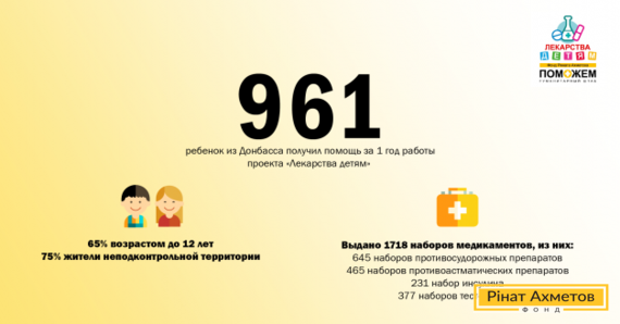 «С началом военных действий на Донбассе сложилась критическая ситуация с медикаментами. На горячую линию Штаба Рината Ахметова поступало все больше обращений от родителей тяжелобольных детей. Основная причина – отсутствие препаратов и государственных программ поддержки детей Донбасса. Люди буквально кричали о помощи. Поэтому Ринат Ахметов принял решение выдавать препараты системно по самым востребованным направлениям. За год работы проекта «Лекарства детям» 961 ребенок получил помощь на лечение астмы, эпилепсии и сахарного диабета», – рассказывает Юлия Герасименко, руководитель программы «Адресная помощь» Гуманитарного штаба.