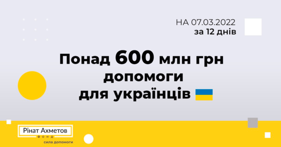 Помогали, помогаем и будем помогать – один из основных и неизменных принципов деятельности Фонда, заложенный Ринатом Ахметовым. За двенадцать дней войны Фонд совместно с бизнесами SCM уже направил более 600 млн. грн помощи для Украины и украинцев. В первую очередь речь идет о гуманитарной помощи (продукты питания, лекарства, наборы первой необходимости), а также помощь городам и громадам.