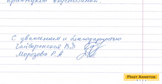 В адрес Рината Ахметова пришло письмо от пенсионерок из Шахтерска. Валентина Яковлевна и Раиса Александровна пишут: «Низкий Вам поклон и сердечно спасибо, что не оставили нас погибать от голода в этой жуткой войне. Наборы продуктов вашей гуманитарной помощи очень помогают нам выжить, а особенно радуют моменты, когда мы можем угостить правнуков вкуснятиной».