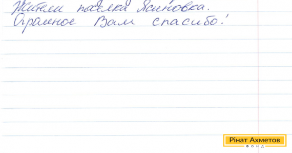 Такое письмо мы получили от макеевских енсионеров из «Хотим выразить благодарность Ринату Ахметову и работникам Штаба в Кировском районе Макеевки за их помощь в нелегкое для нас время».