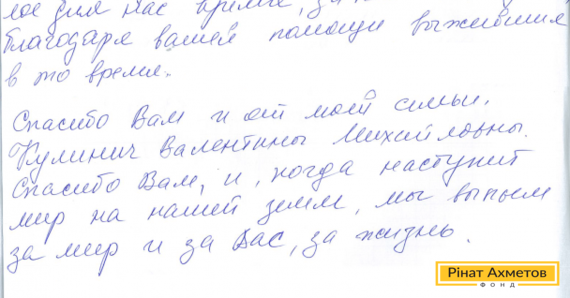 В адрес Гуманитарного штаба Рината Ахметова пришло письмо от жительницы Донецка. Валентина Михайловна пишет: «Спасибо Вам и низкий поклон за Вашу поддержку в самое тяжелое для нас время, за наших бабушек, выживших благодаря вашей помощи».