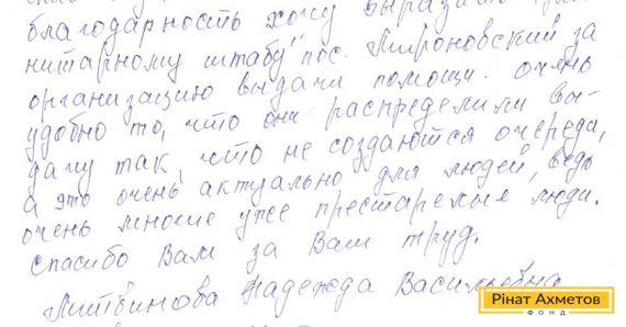 Недавно в Гуманитарный штаб Рината Ахметова пришло письмо от жительницы поселка Мироновский. Женщина благодарит Рината Ахметова и команду Гуманитарного штаба.
