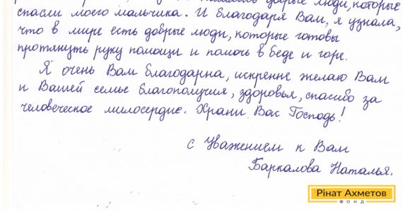 Письмо с благодарностью за адресную медикаментозную помощь пришло Ринату Ахметову от жительницы Донецкой области. Наталья обратилась в Штаб с просьбой помочь необходимыми препаратами сыну-эпилептику.