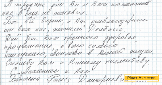 В адрес Рината Ахметова и команды Гуманитарного штаба пришло письмо от пенсионерки, проживающей в Куйбышевском районе Донецка. Раиса Дмитриевна пишет: «Большое Вам искренне спасибо за Ваше отношение к пенсионерам. Спасибо Вам и Вашему коллективу за быстрое обслуживание, за чуткое понимание, отзывчивость. В трудное время Вы и Ваш коллектив нас в беде не оставили».