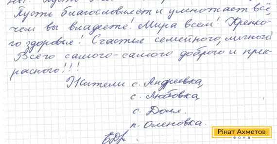 В адрес Гуманитарного штаба Рината Ахметова пришло письмо от жителей Донецкой области. Они пишут: «Для нас Ваша помощь очень важна и неоценима. Поэтому мы все Вам очень благодарны».
