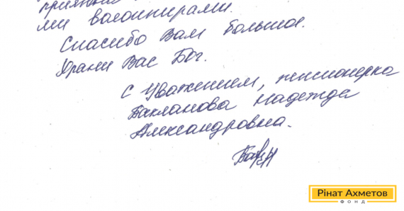 В адрес Рината Ахметова и команды Гуманитарного штаба пришла благодарность от пенсионерки из г. Макеевки. Надежда Александровна пишет: «Выражаю огромную благодарность за помощь, которую Вы оказываете в это тяжелое, неспокойное время. Вы и Ваша большая команда делаете очень большое, а главное очень важное дело».