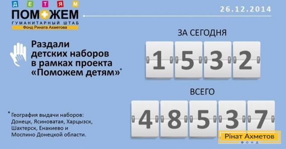 За 26 декабря, в рамках проекта "ПОМОЖЕМ детям" в Донецке, Макеевке (на стадионе "Донбасс Арена"), а также в Ясиноватой, Харцызске, Шахтерске, Енакиево и Моспино Донецкой области волонтеры ФК "Шахтер" раздали 1532 "детских набора" для детей от 0 до 2-х лет.