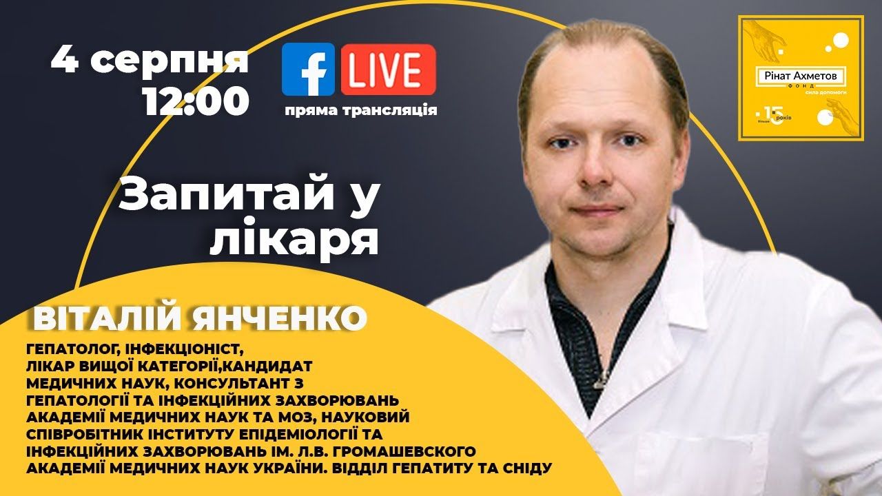 Проект Фонда Рината Ахметова «Спроси у доктора» продолжает цикл прямых трансляций о COVID-19 с ключевыми медицинскими экспертами страны. Что вредит работе печени во время и после COVID-19? Как обезопасить себя? На эти и другие вопросы в очередном выпуске онлайн-проекта «Спроси у доктора» Фонда Рината Ахметова отвечает гепатолог, инфекционист, врач высшей категории, кандидат медицинских наук, консультант по гепатологии и инфекционным заболеваниям Академии медицинских наук и Минздрава, научный сотрудник Института эпидемиологии и инфекционных болезней им. Л.В. Громашевского Виталий Янченко.